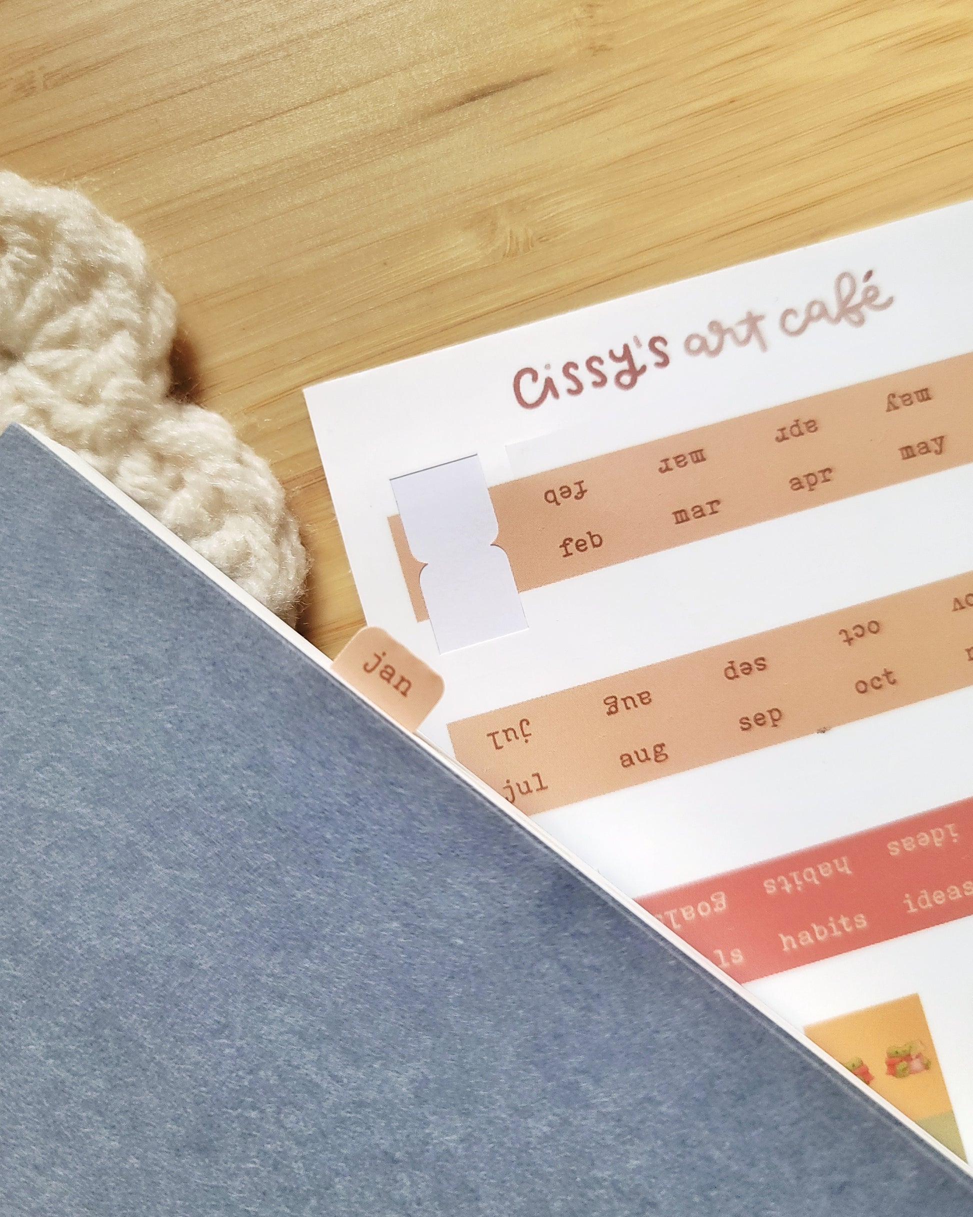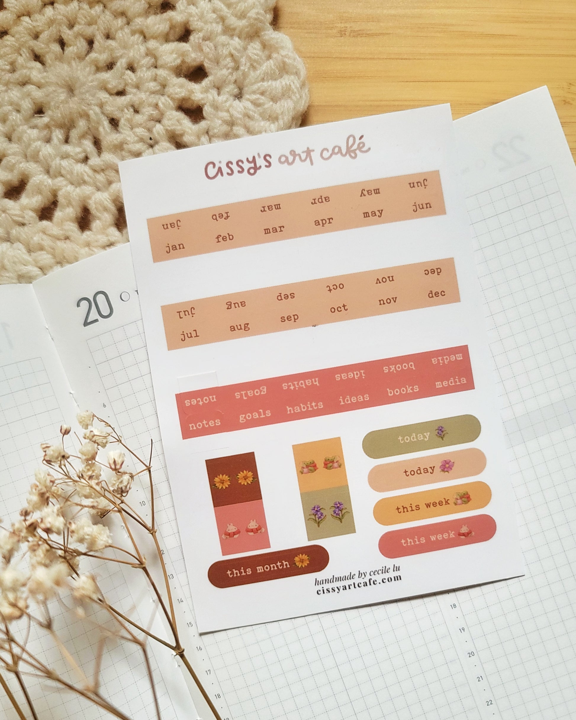 A set of tabs for your planner! The colors are designed to match with the rest of the functional planner sticker sheets that I've created. They are printed on sturdy vinyl and should hold up on your planner pages for the entire year.