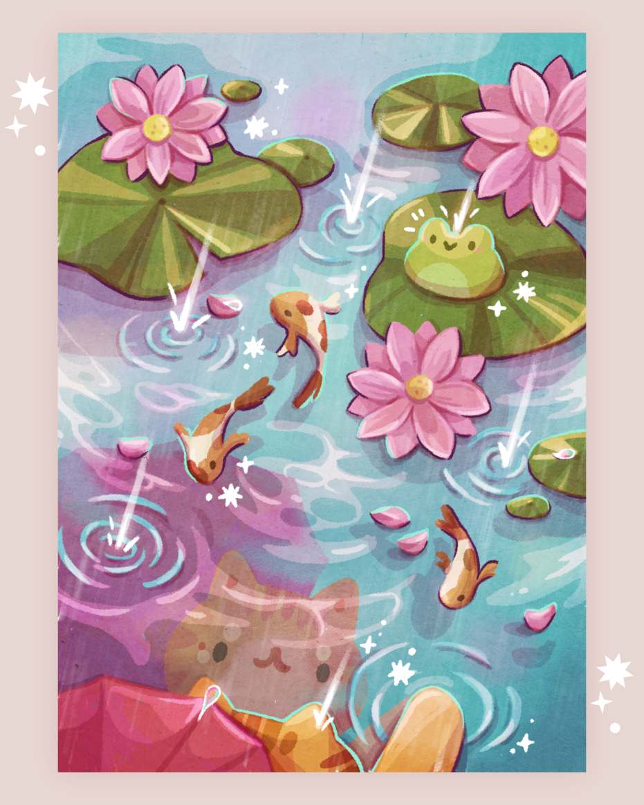 An inquisitive little kitty investigating a koi pond on a rainy day.