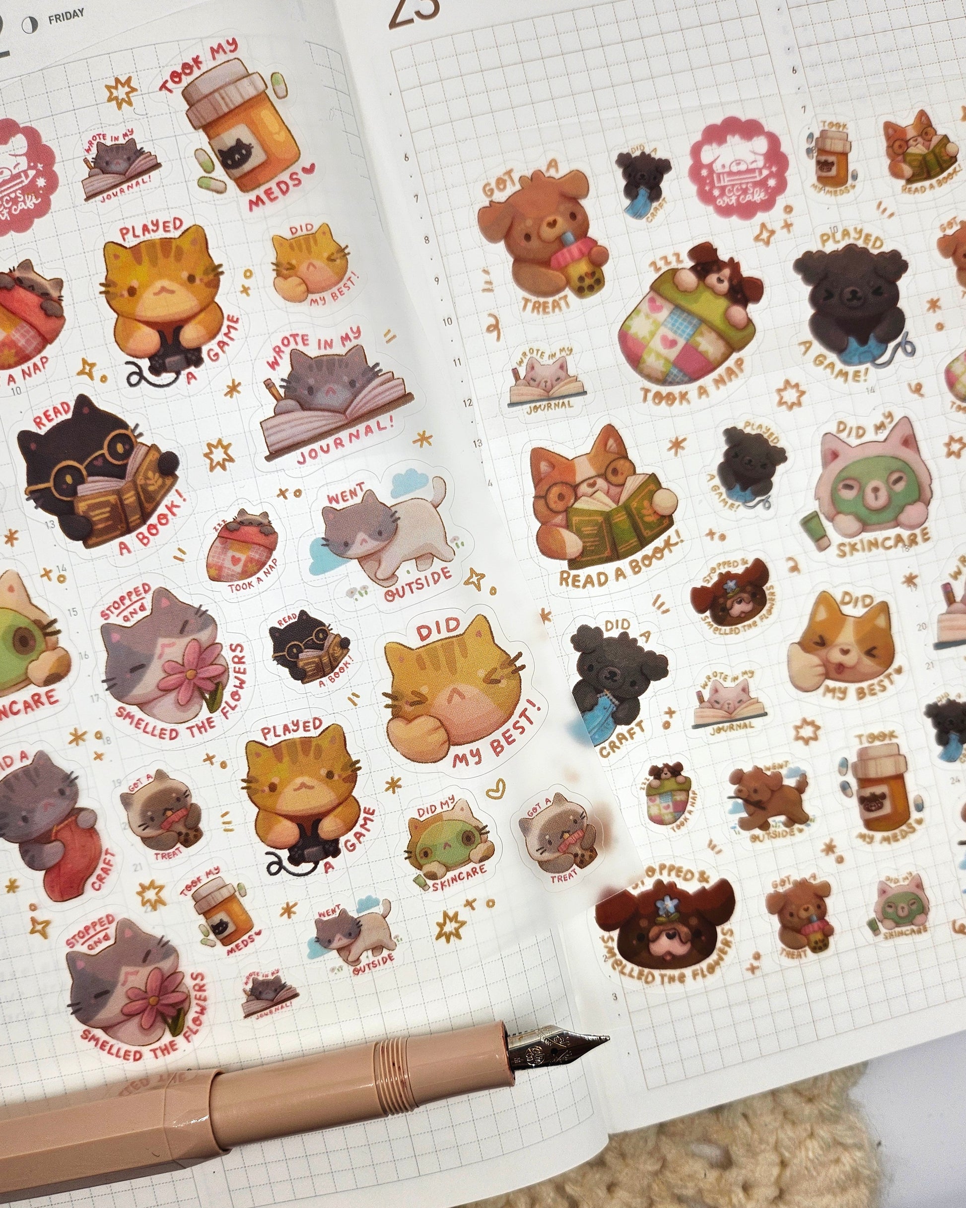 Don't forget to take care of yourself this coming year ♡ These are printed on clear vinyl sticker paper and measure 4.6 inches.