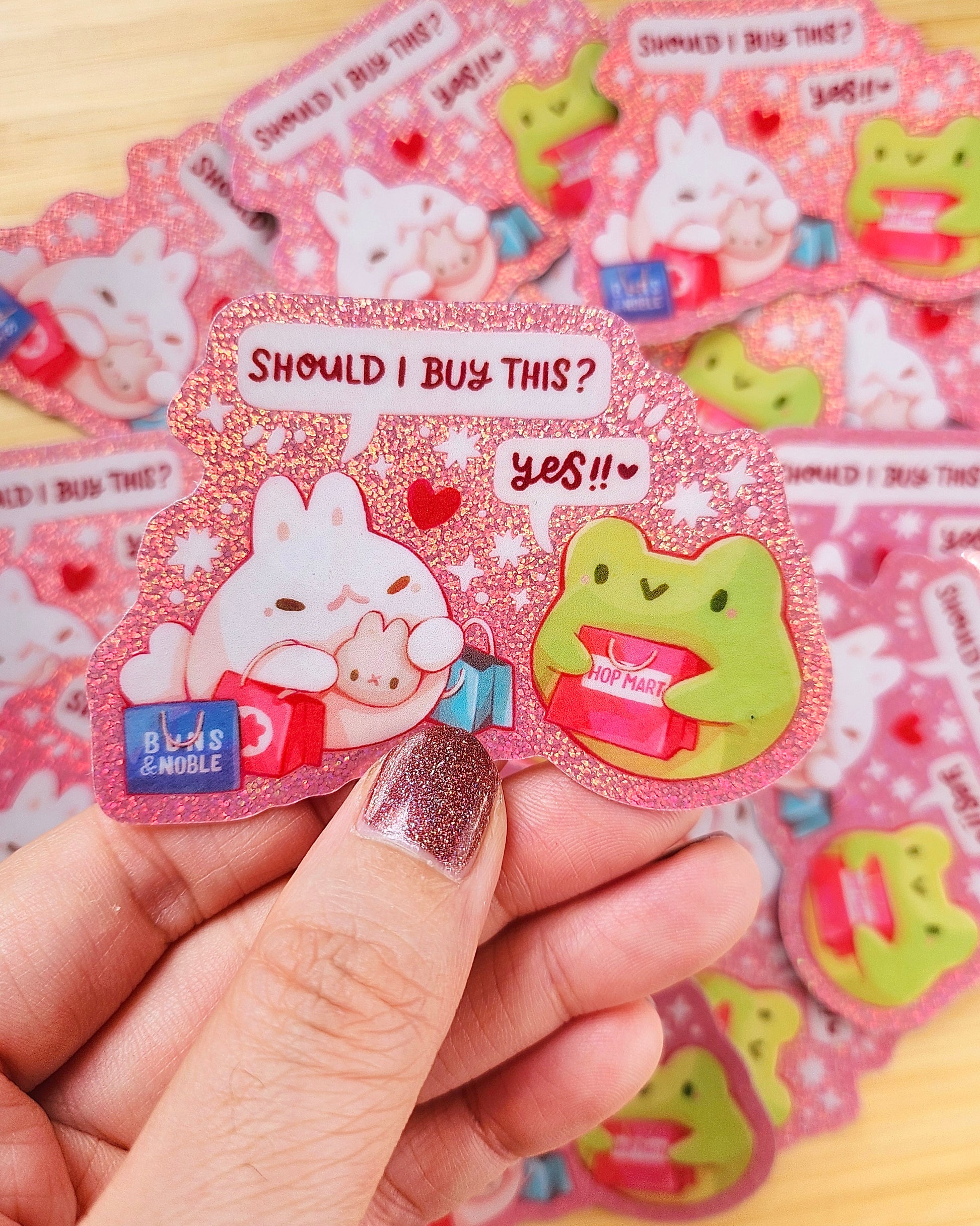 This sticker measures approximately 3 inches across, with a fun holographic glitter background. It is water resistant (so you can stick it on your water bottle!) but not dishwasher safe.
