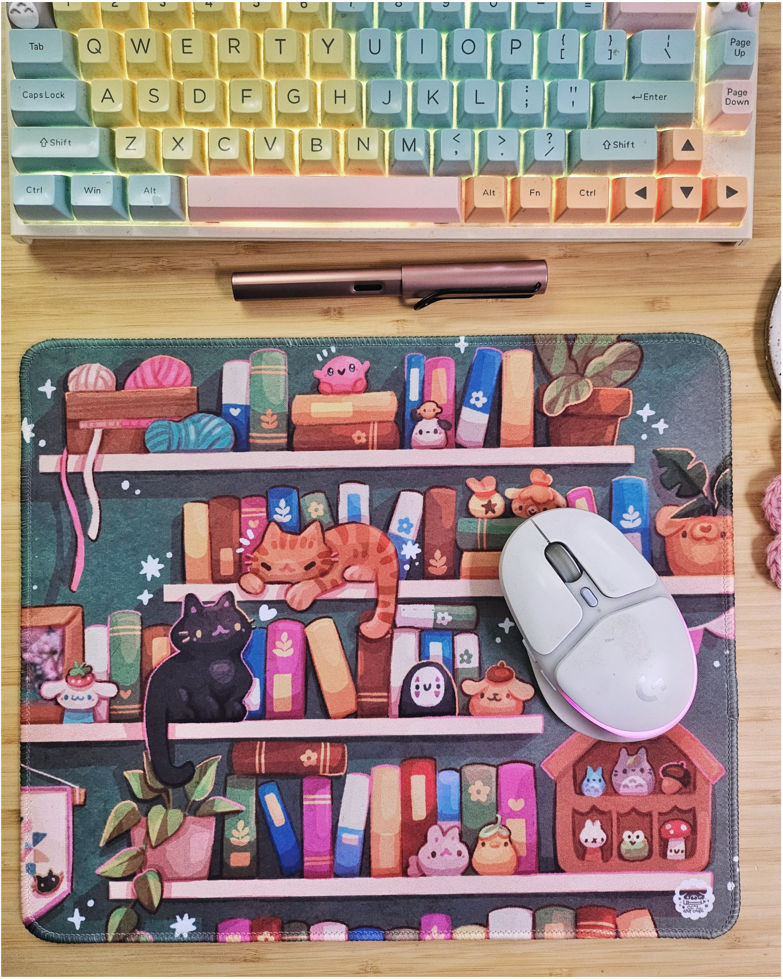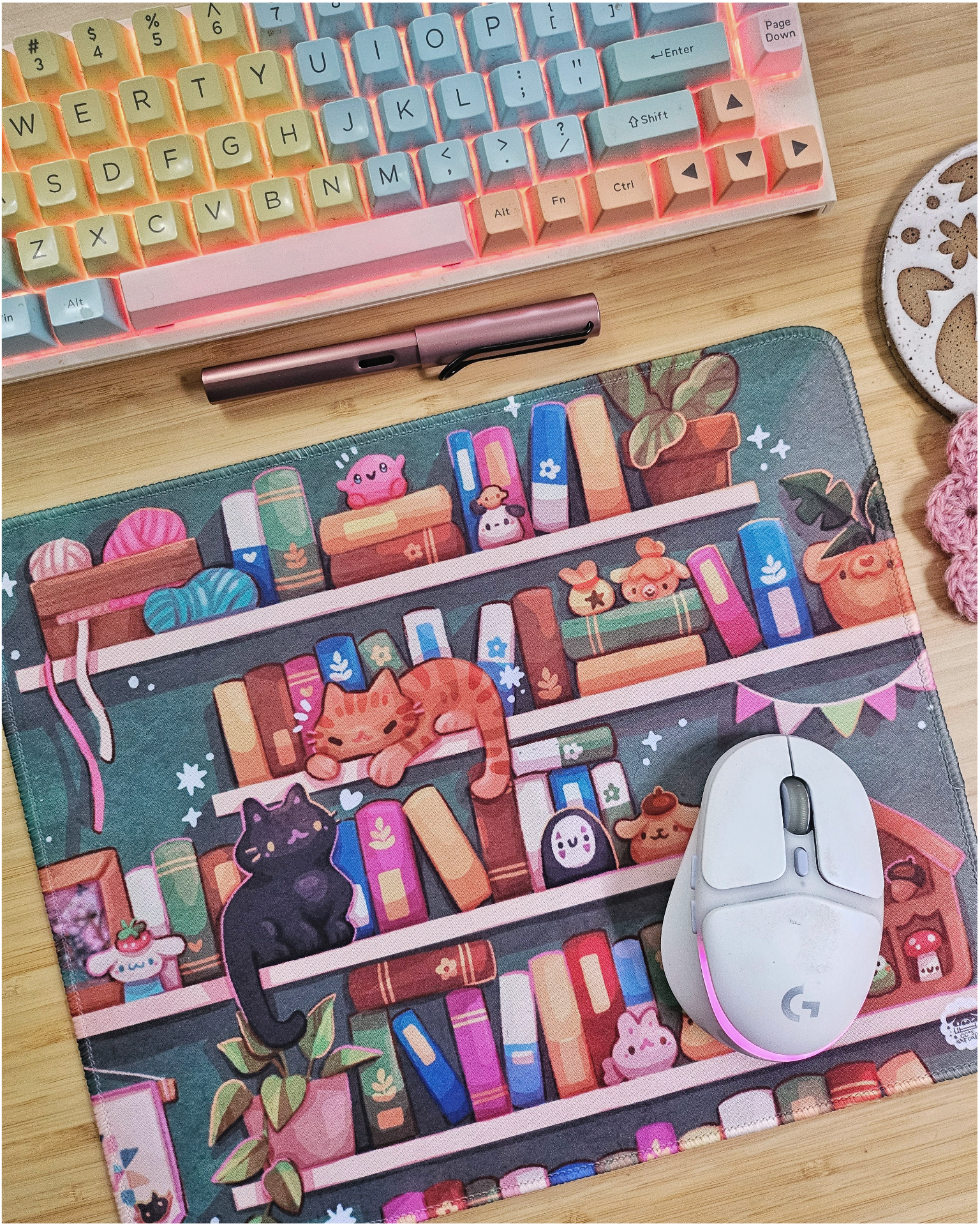 A thick mousepad perfect for protecting your desk and adding some color to your work space! This mousepad measures approximately 10.5 x 12.5 inches and is 3 mm thick, creating a nice plushy surface for your mouse to glide across as you work and game.
