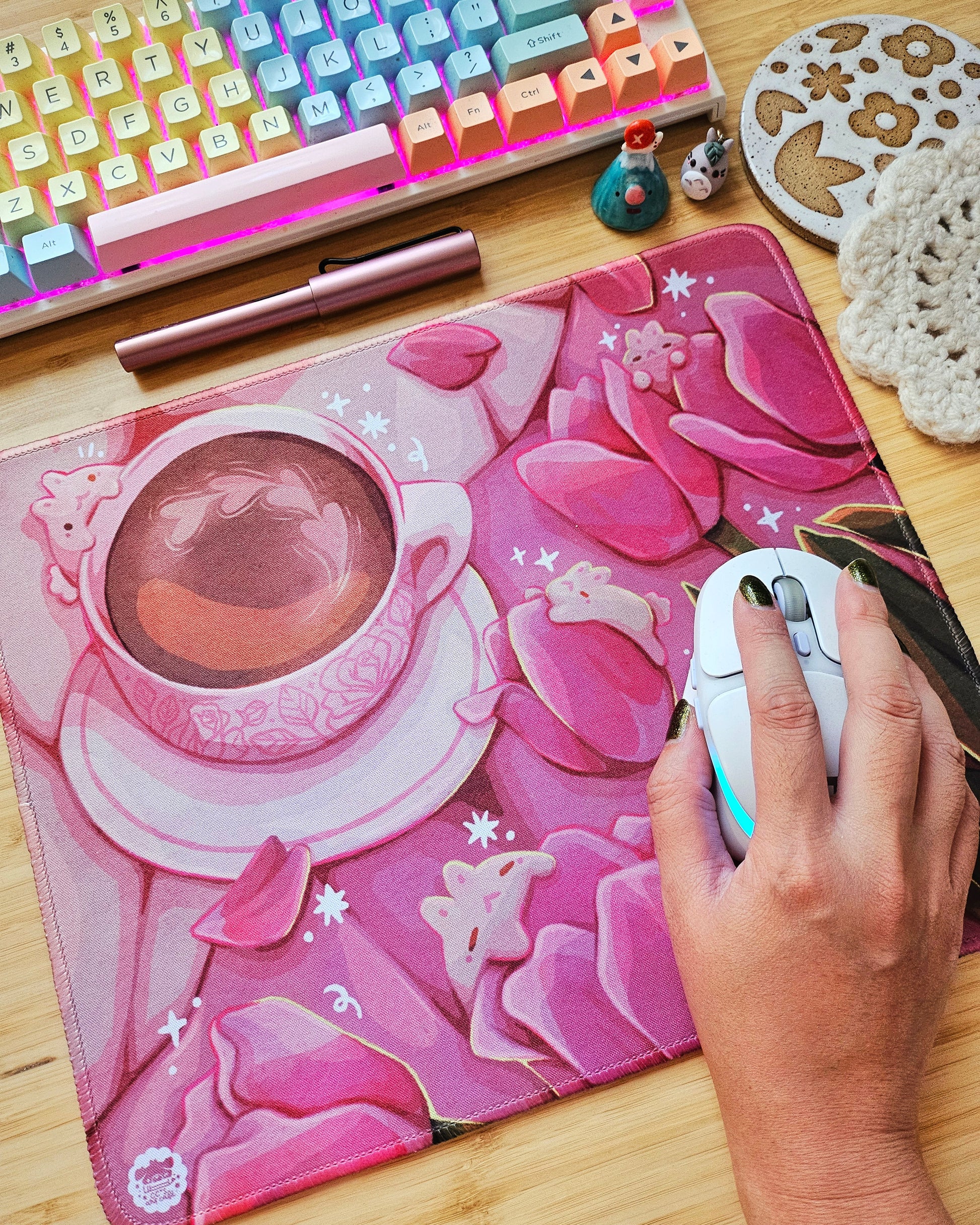 A thick mousepad perfect for protecting your desk and adding some color to your work space! This mousepad measures approximately 10.5 x 12.5 inches and is 3 mm thick, creating a nice plushy surface for your mouse to glide across as you work and game.
